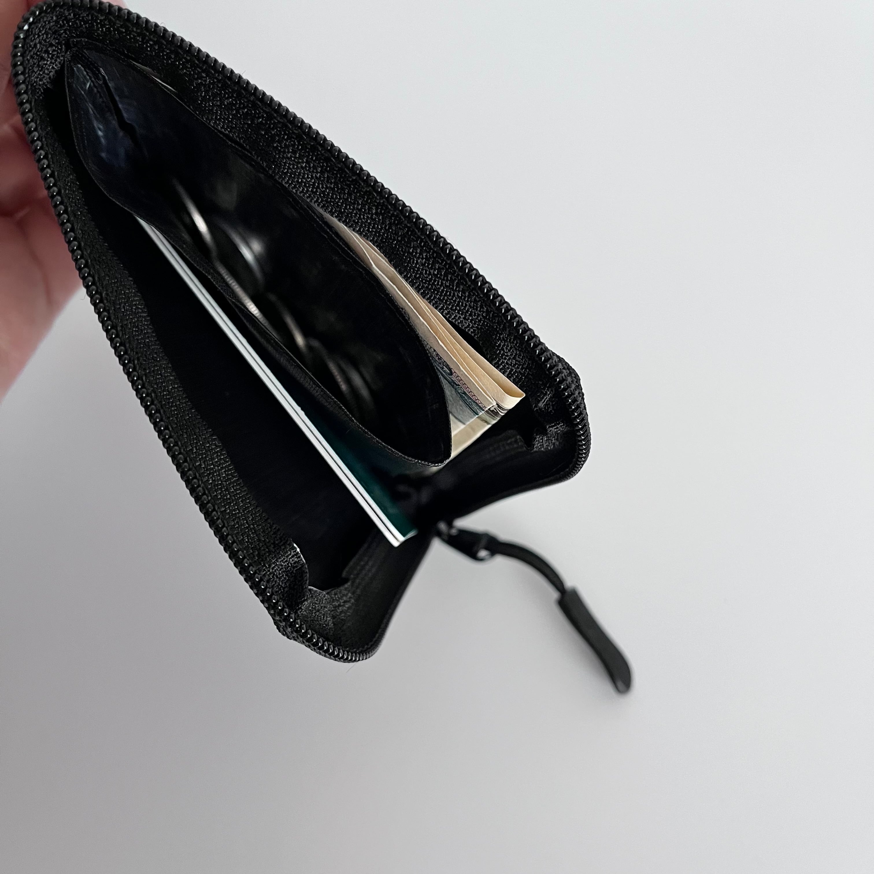 •L字ジップで大きく開き、中央に小銭・両側にカードやお札(二つ折り収納OK)